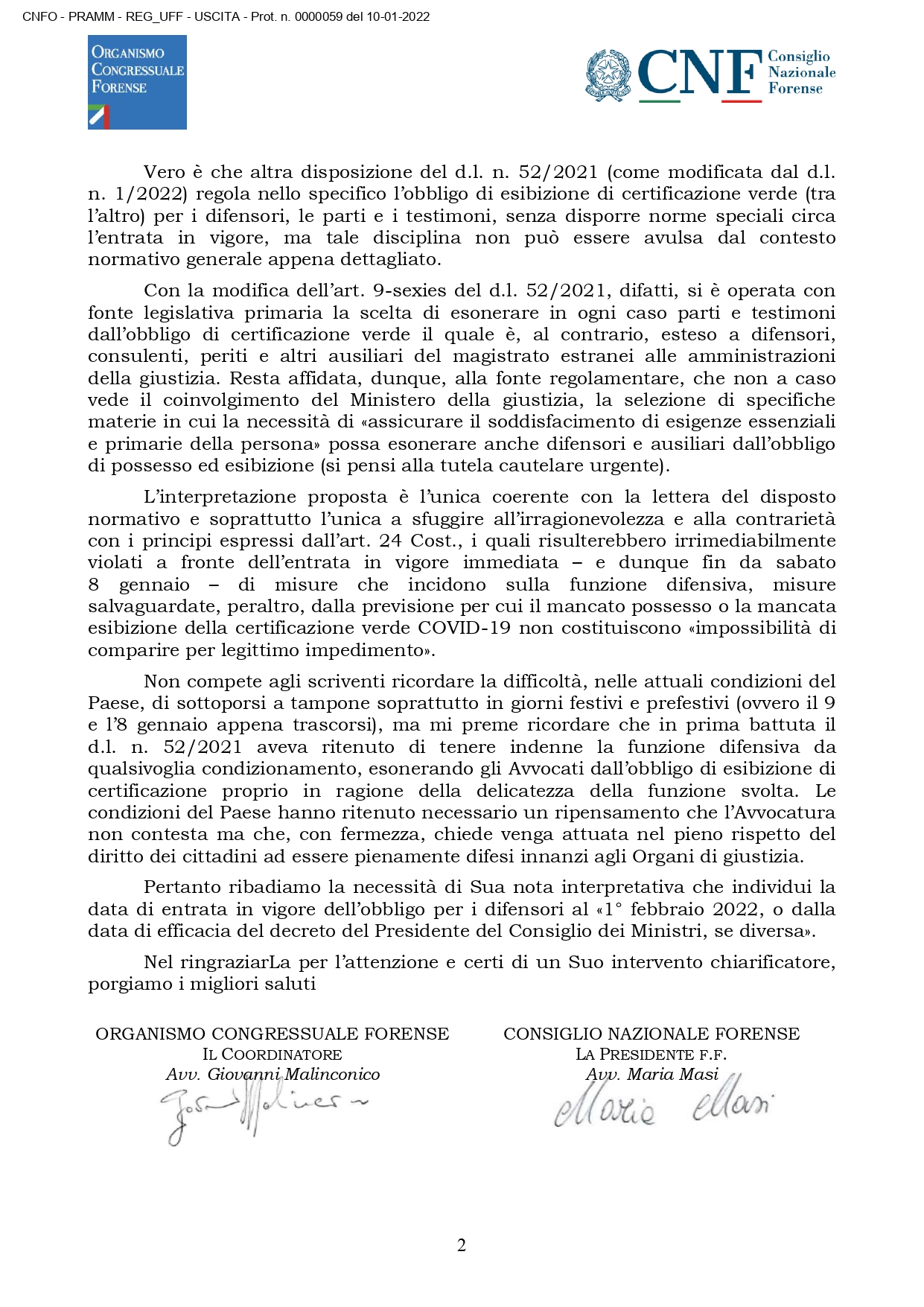 OCF e CNF chiedono al Ministro della Giustizia una urgente nota interpretativa che individui la data di entrata in vigore dell?obbligo per i difensori al «1° febbraio 2022, o dalla data di efficacia del decreto del Presidente del Consiglio dei Ministri, se diversa».