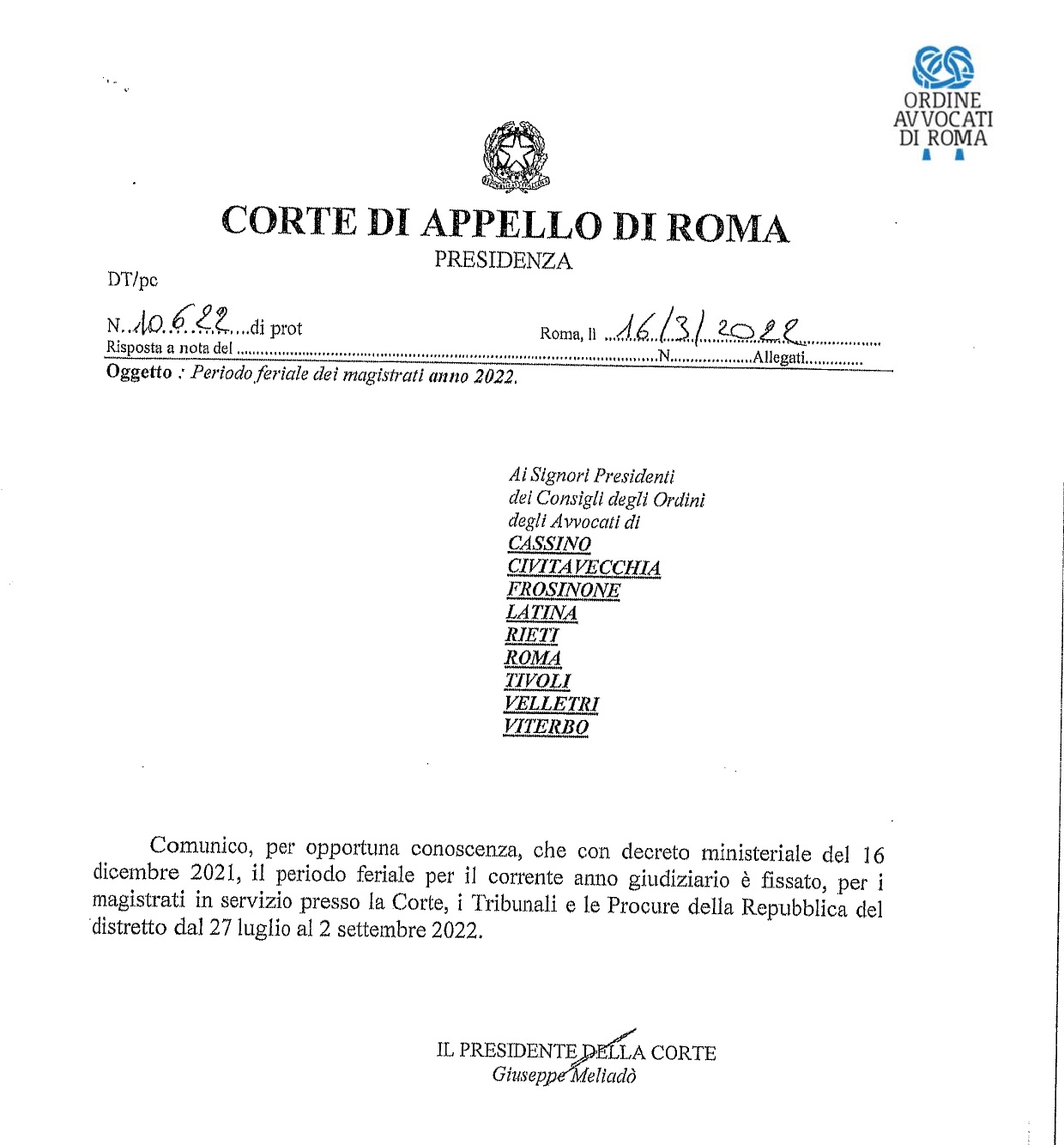 PERIODO FERIALE DEI MAGISTRATI ANNO 2022 - dal 27 LUGLIO al 2 SETTEMBRE 2022