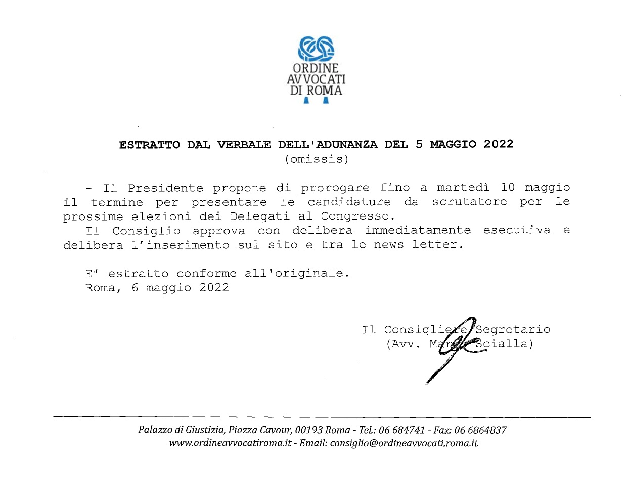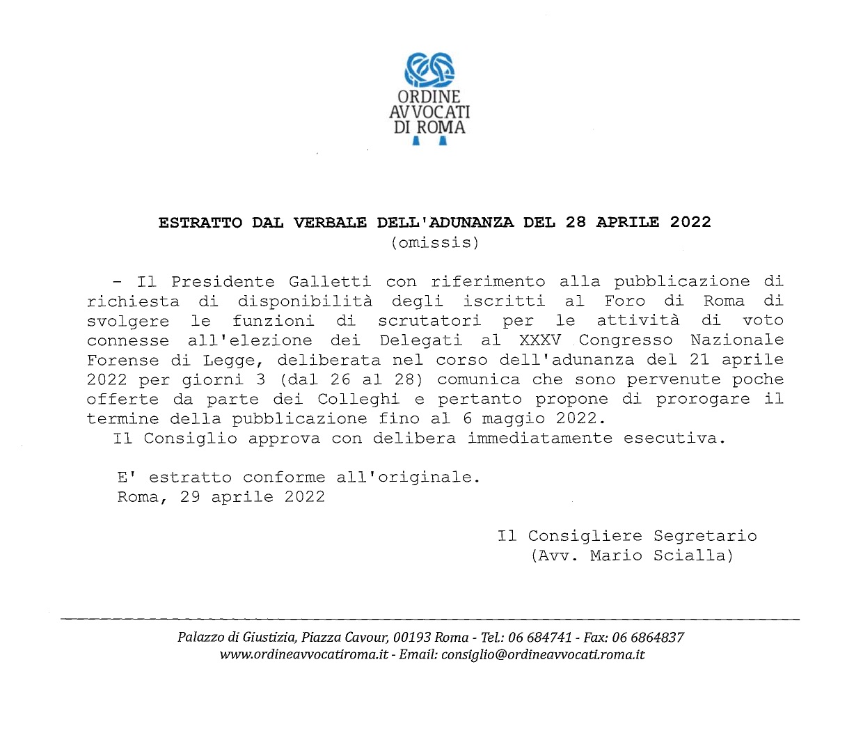 PROROGA al 10.05.2022: DISPONIBILITA' SCRUTATORI - ELEZIONI DELEGATI AL XXXV CONGRESSO NAZIONALE FORENSE