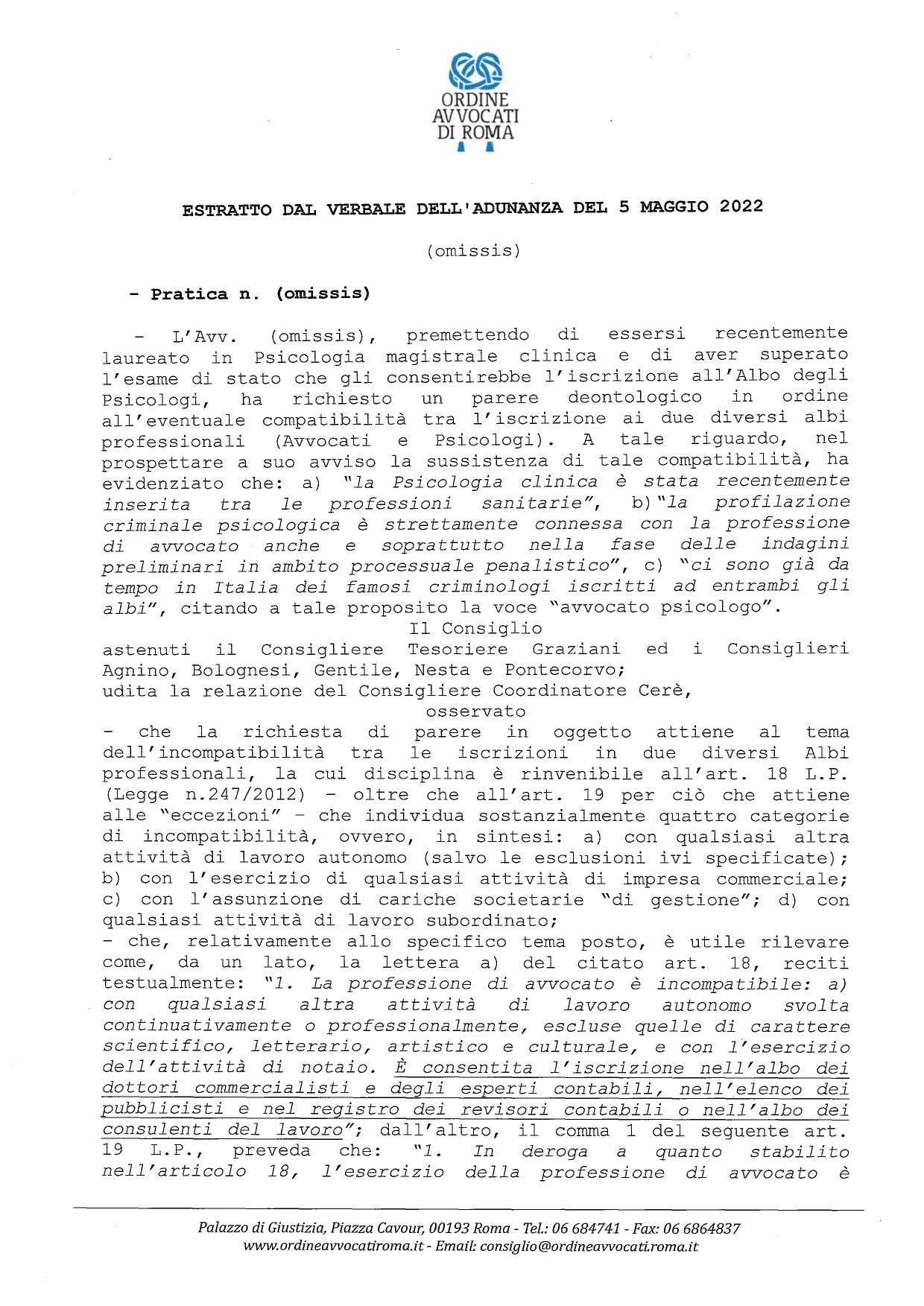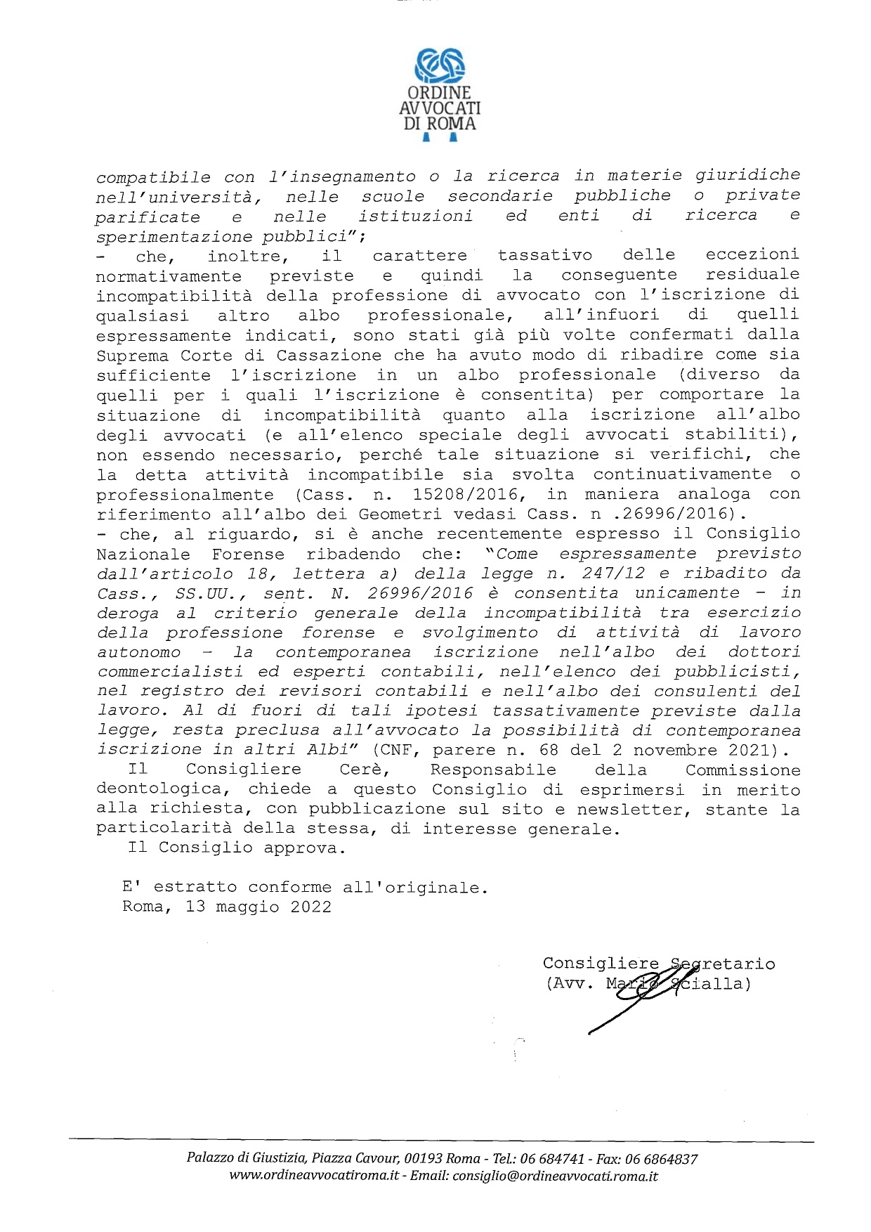 PARERE DEONTOLOGICO - Compatibilità iscrizione all'Albo