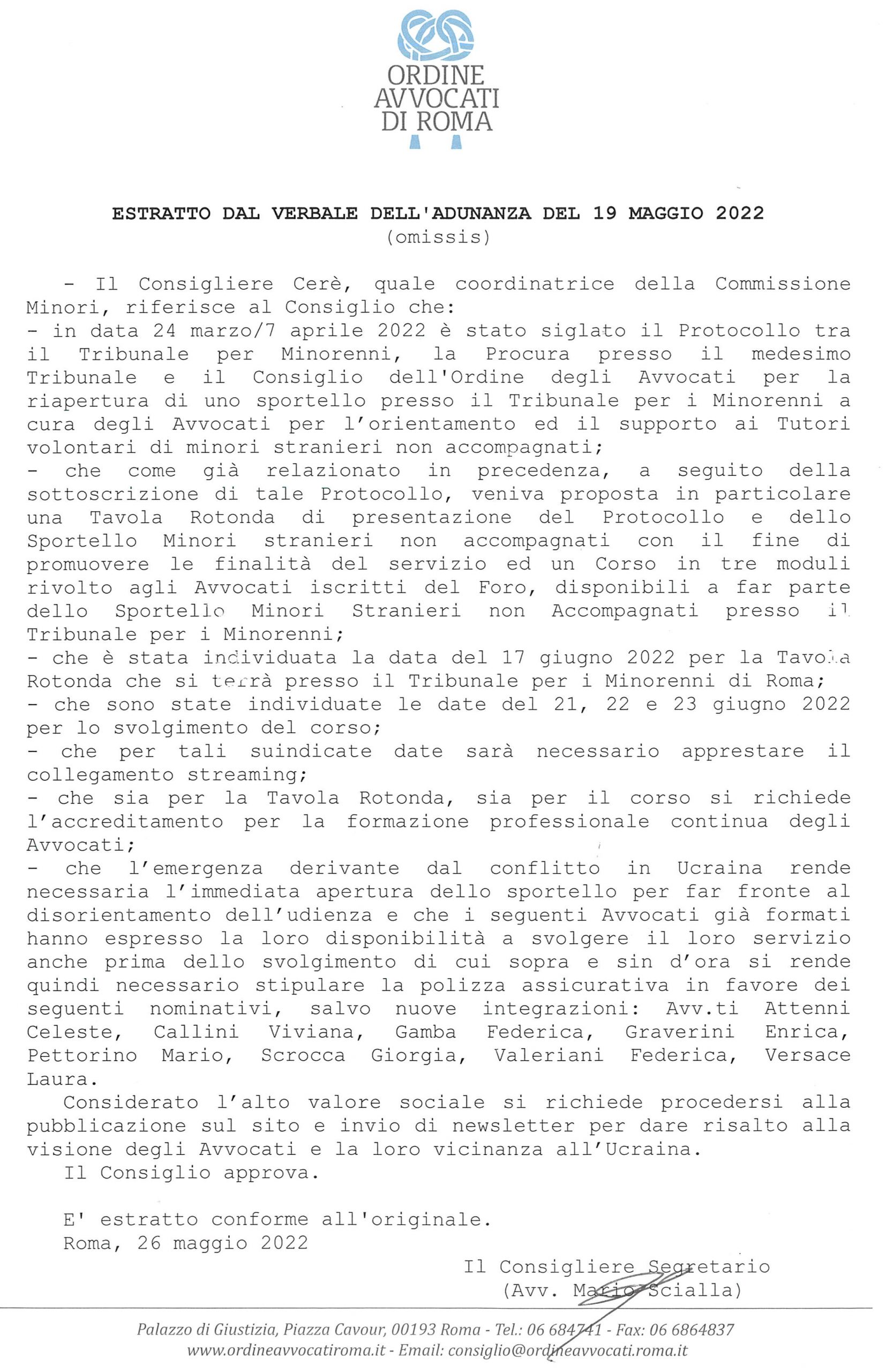 Sportello e corso Minori - Delibera COA Roma 19.05.2022