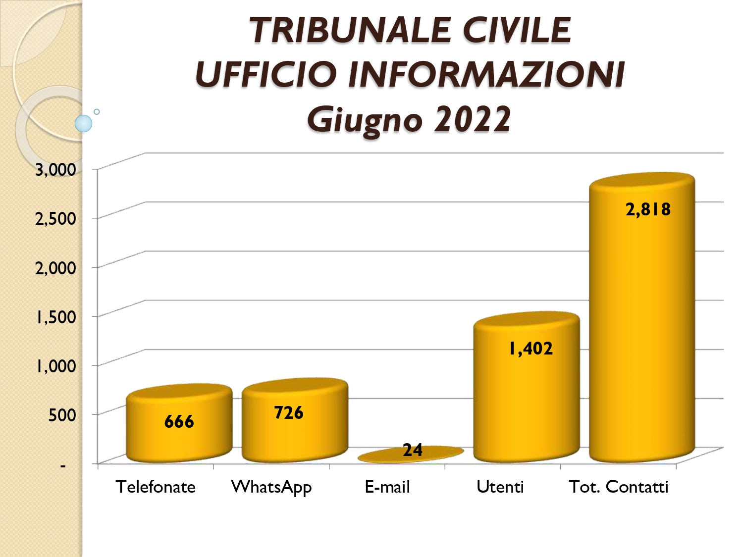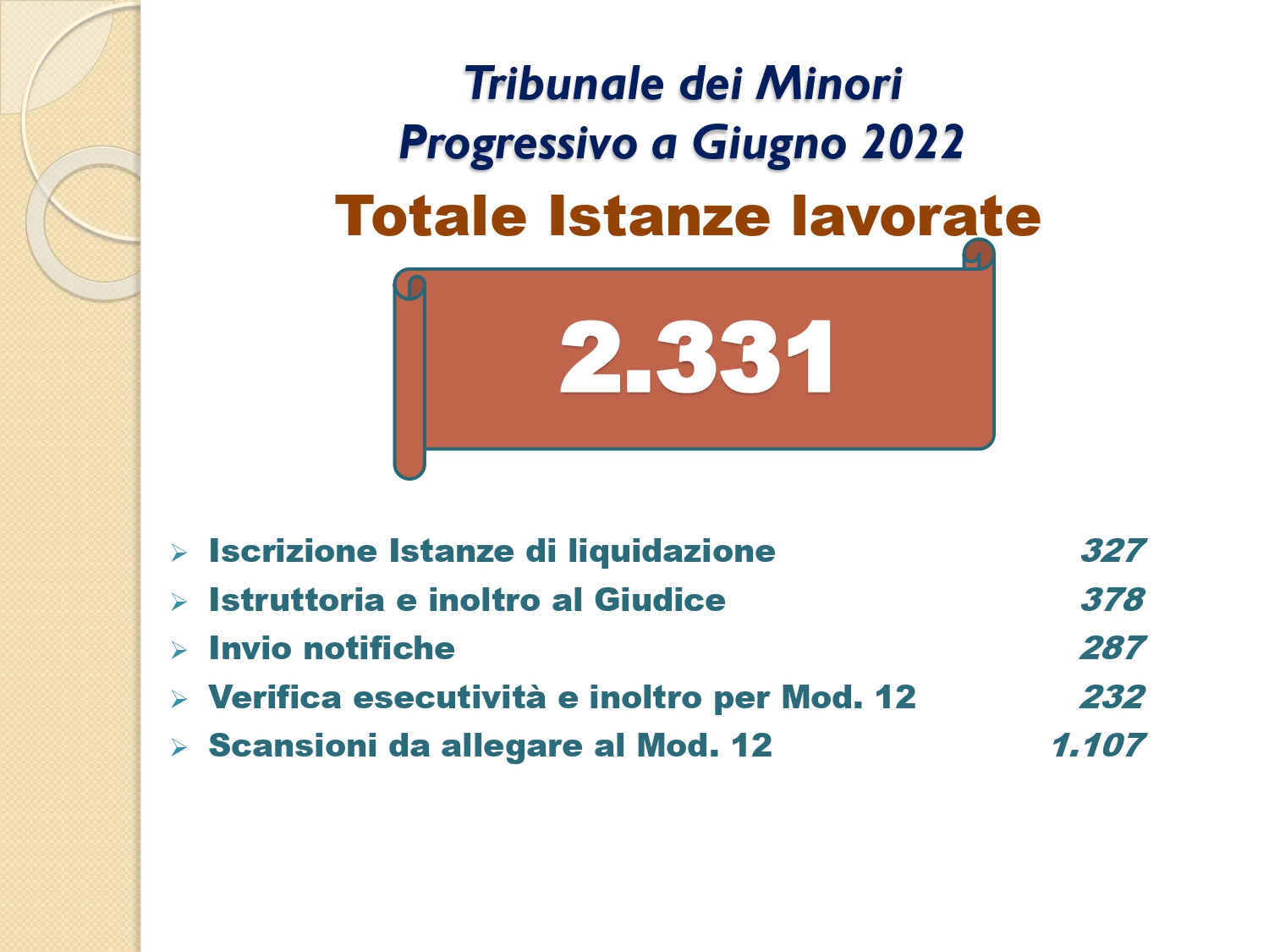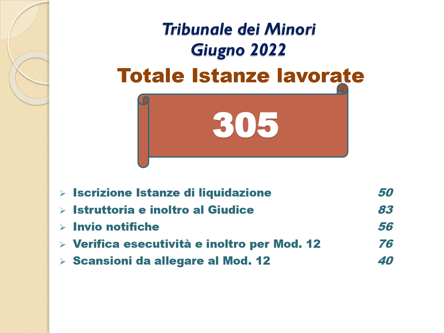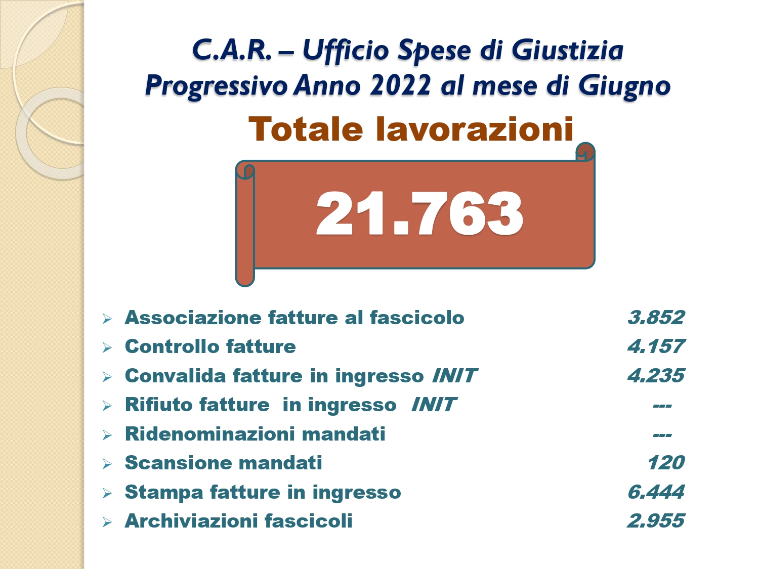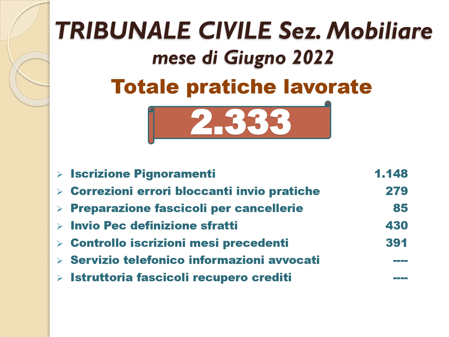 Il Consigliere Pontecorvo, nell?ambito dell?attività di monitoraggio e diffusione dei dati relativi al lavoro svolto dal personale a carico dell?Ordine e dislocato negli Uffici Giudiziari capitolini, illustra i dati aggiornati al mese di GIUGNO 2022: