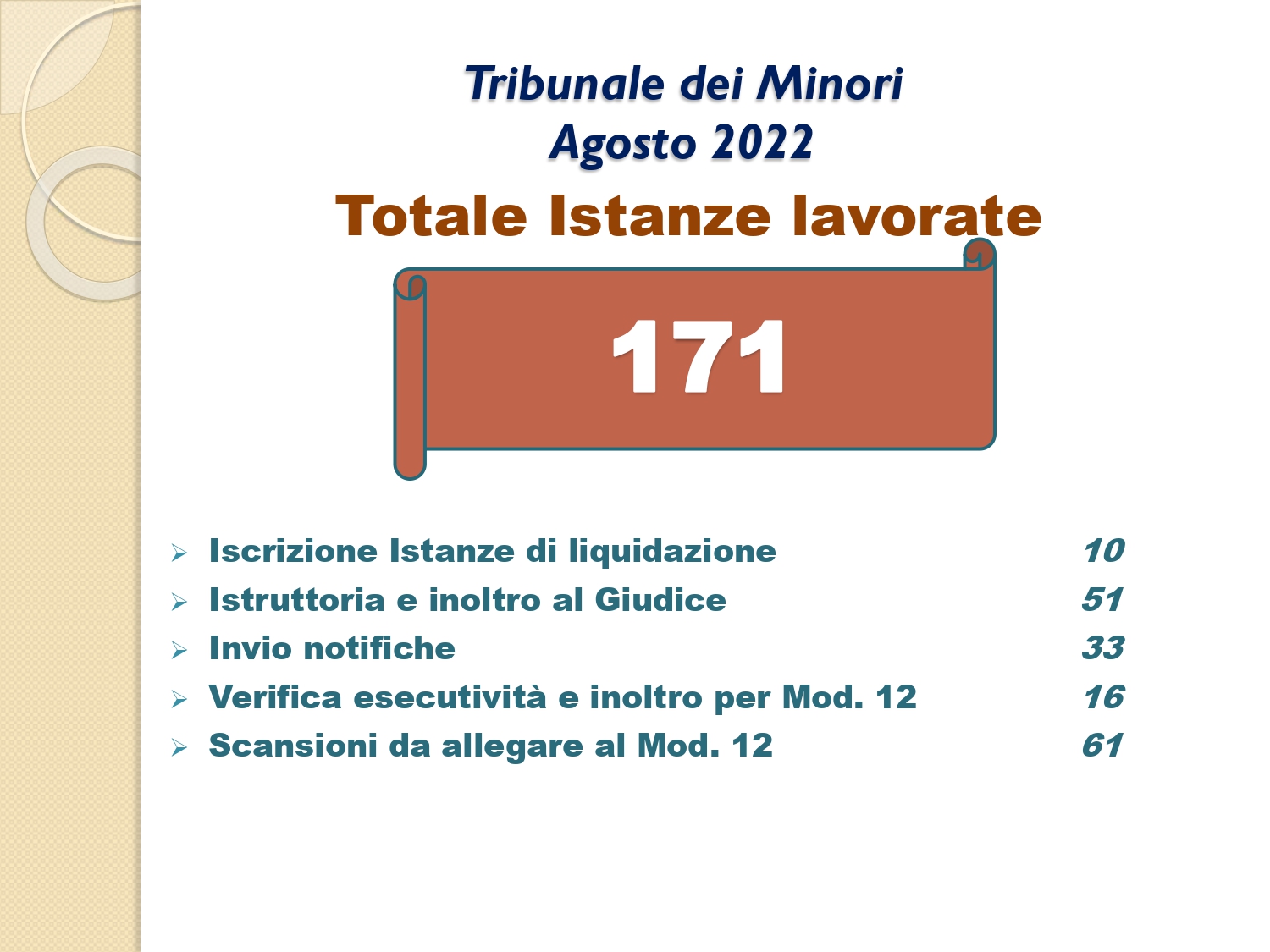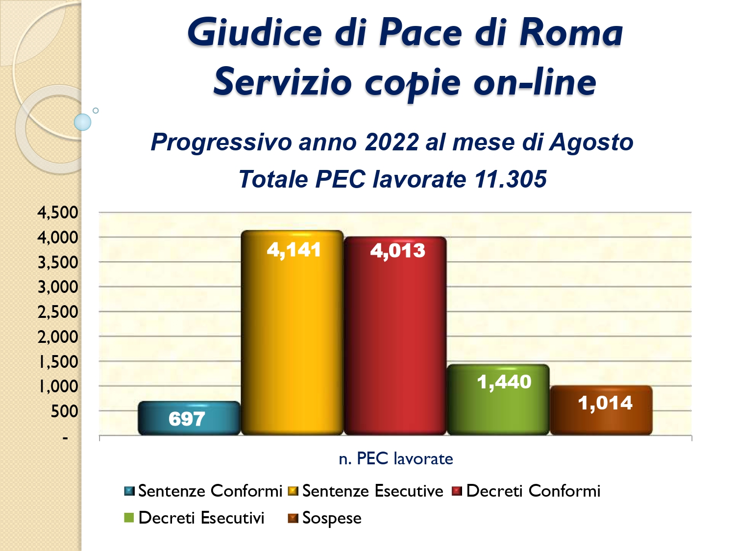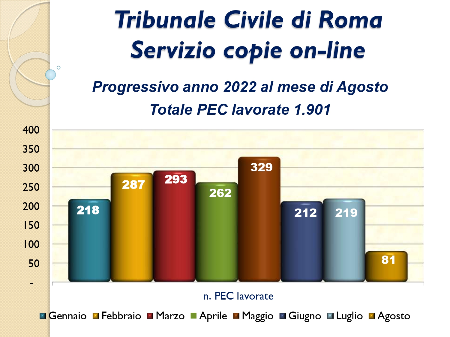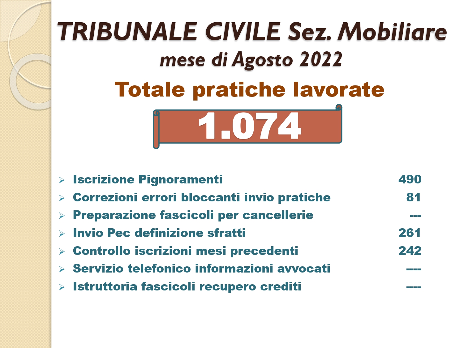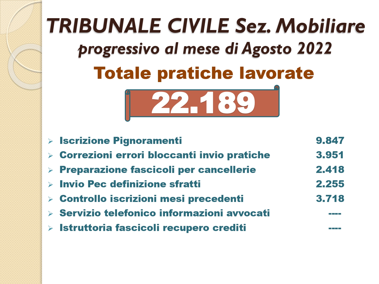 Il Consigliere Pontecorvo, nell?ambito dell?attività di monitoraggio e diffusione dei dati relativi al lavoro svolto dal personale a carico dell?Ordine e dislocato negli Uffici Giudiziari capitolini, illustra i dati aggiornati al mese di AGOSTO 2022: