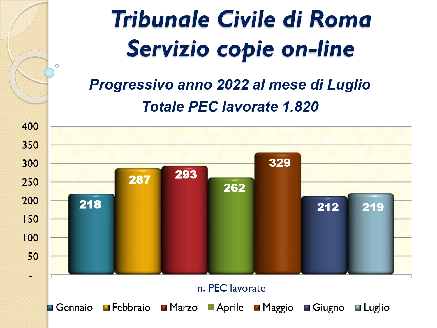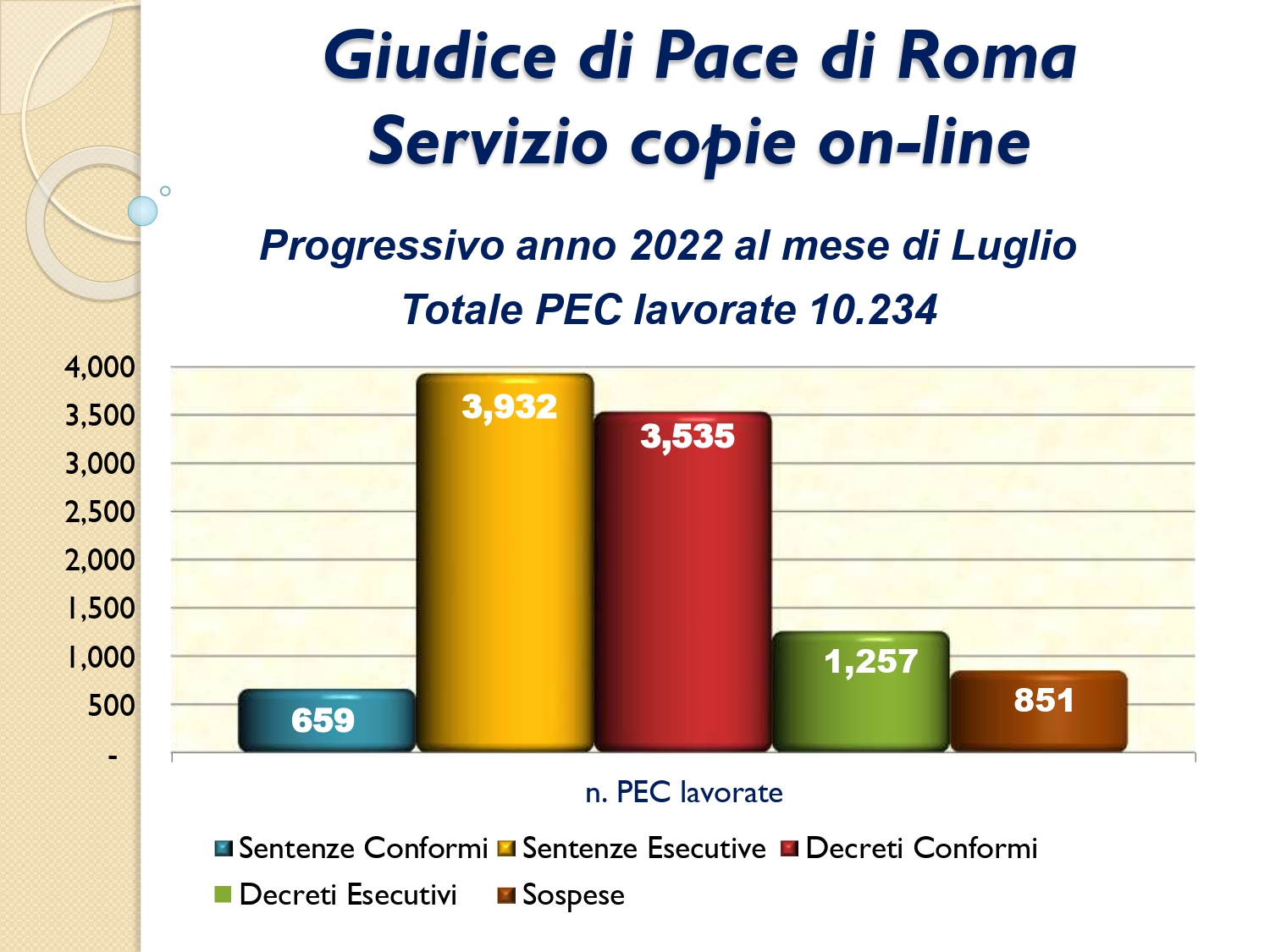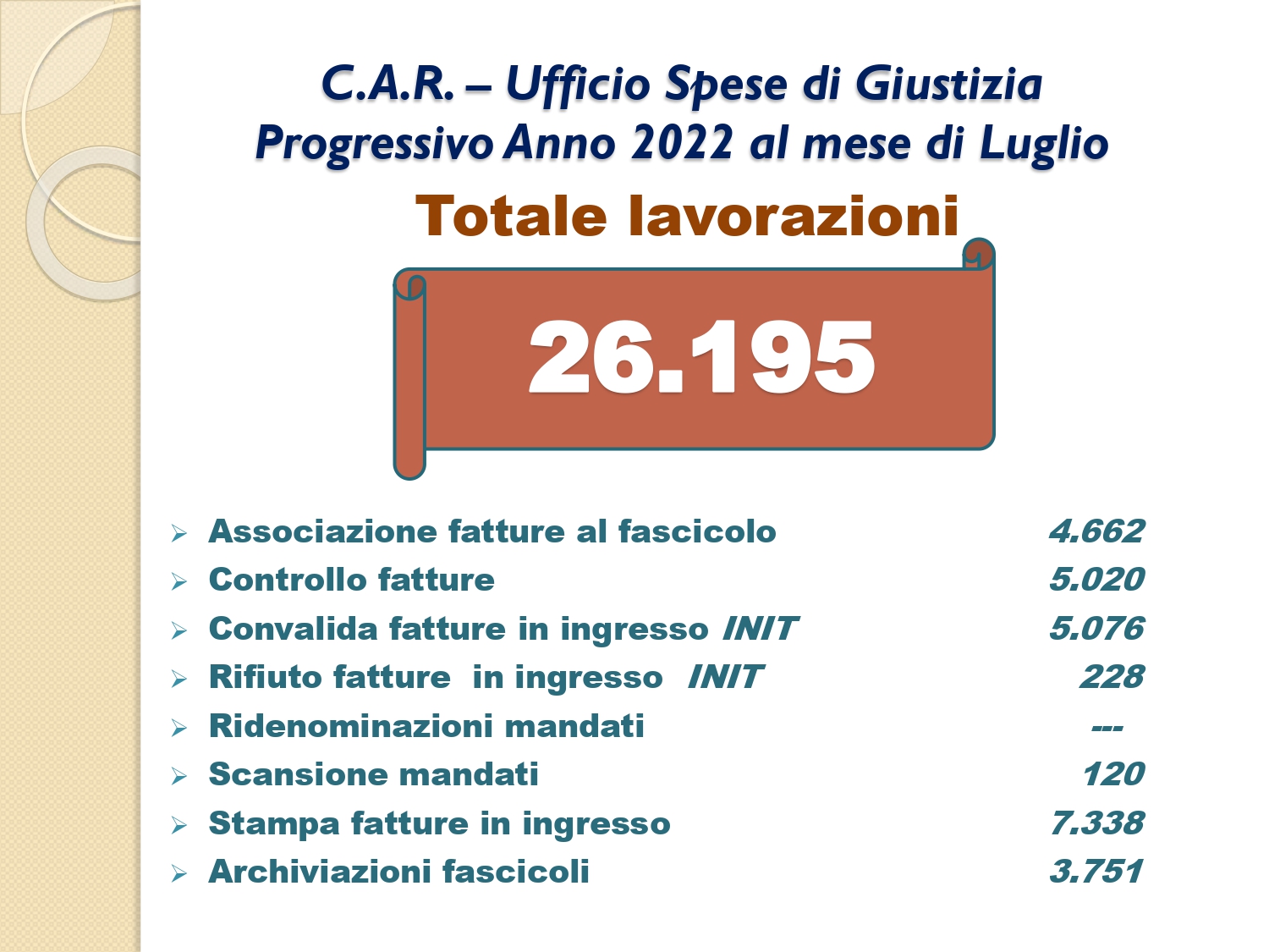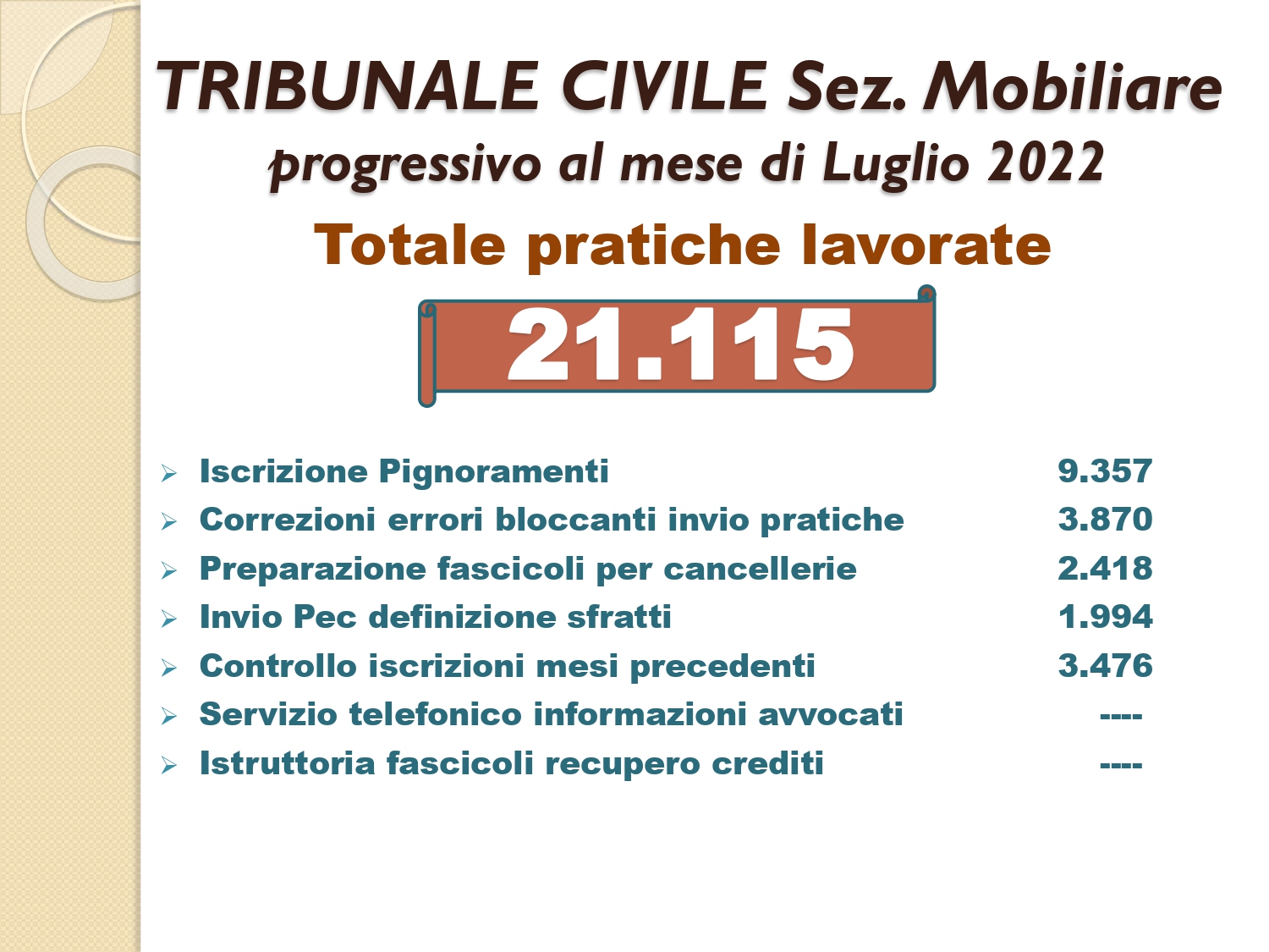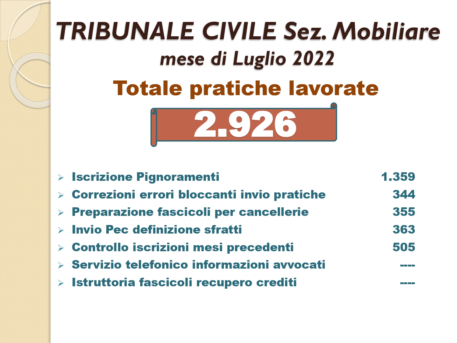Il Consigliere Pontecorvo, nell?ambito dell?attività di monitoraggio e diffusione dei dati relativi al lavoro svolto dal personale a carico dell?Ordine e dislocato negli Uffici Giudiziari capitolini, illustra i dati aggiornati al mese di LUGLIO 2022: