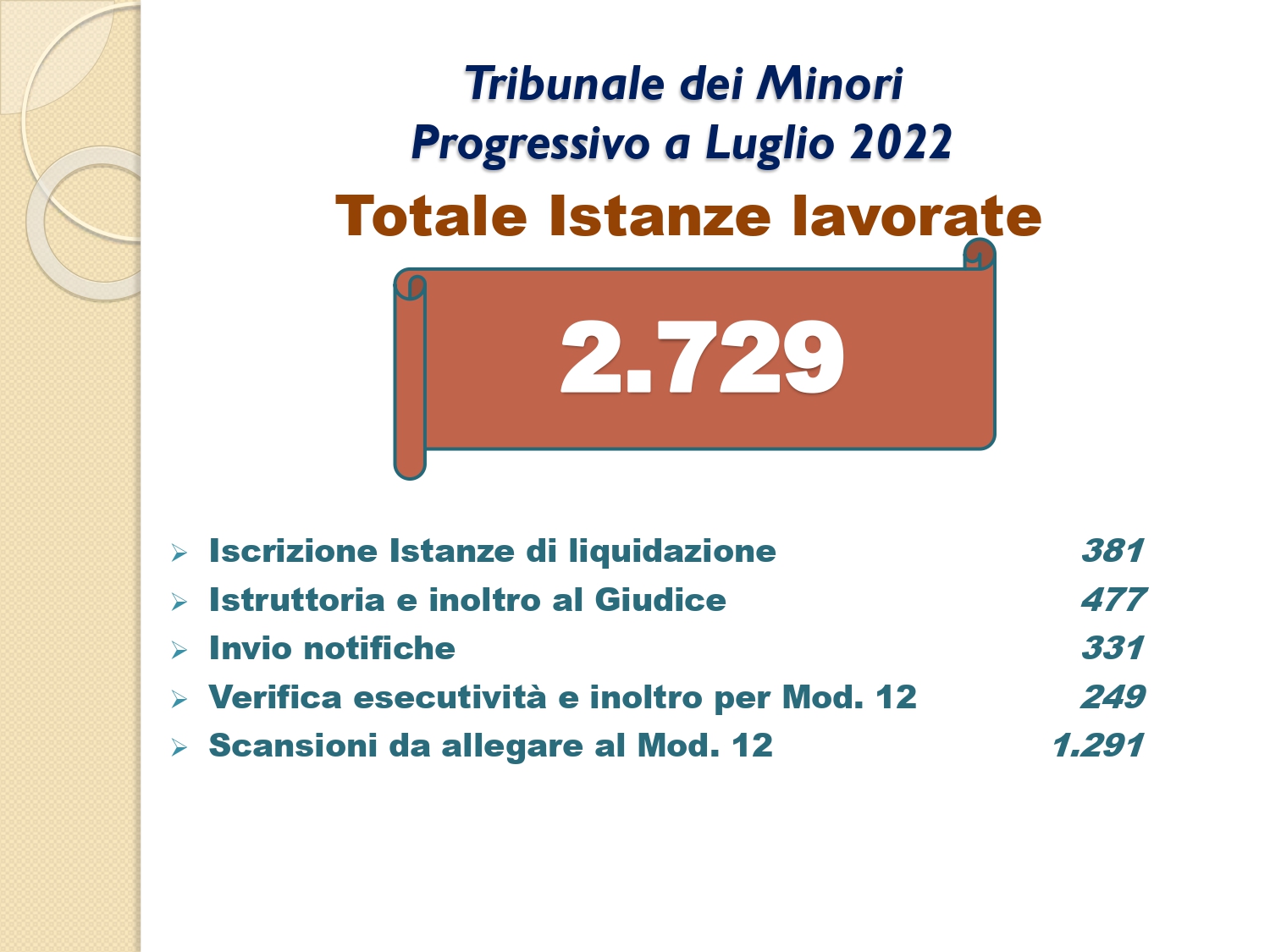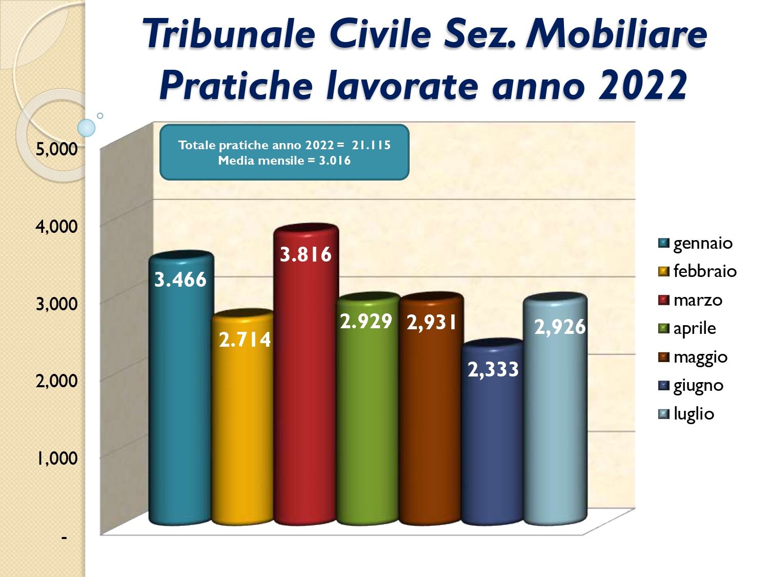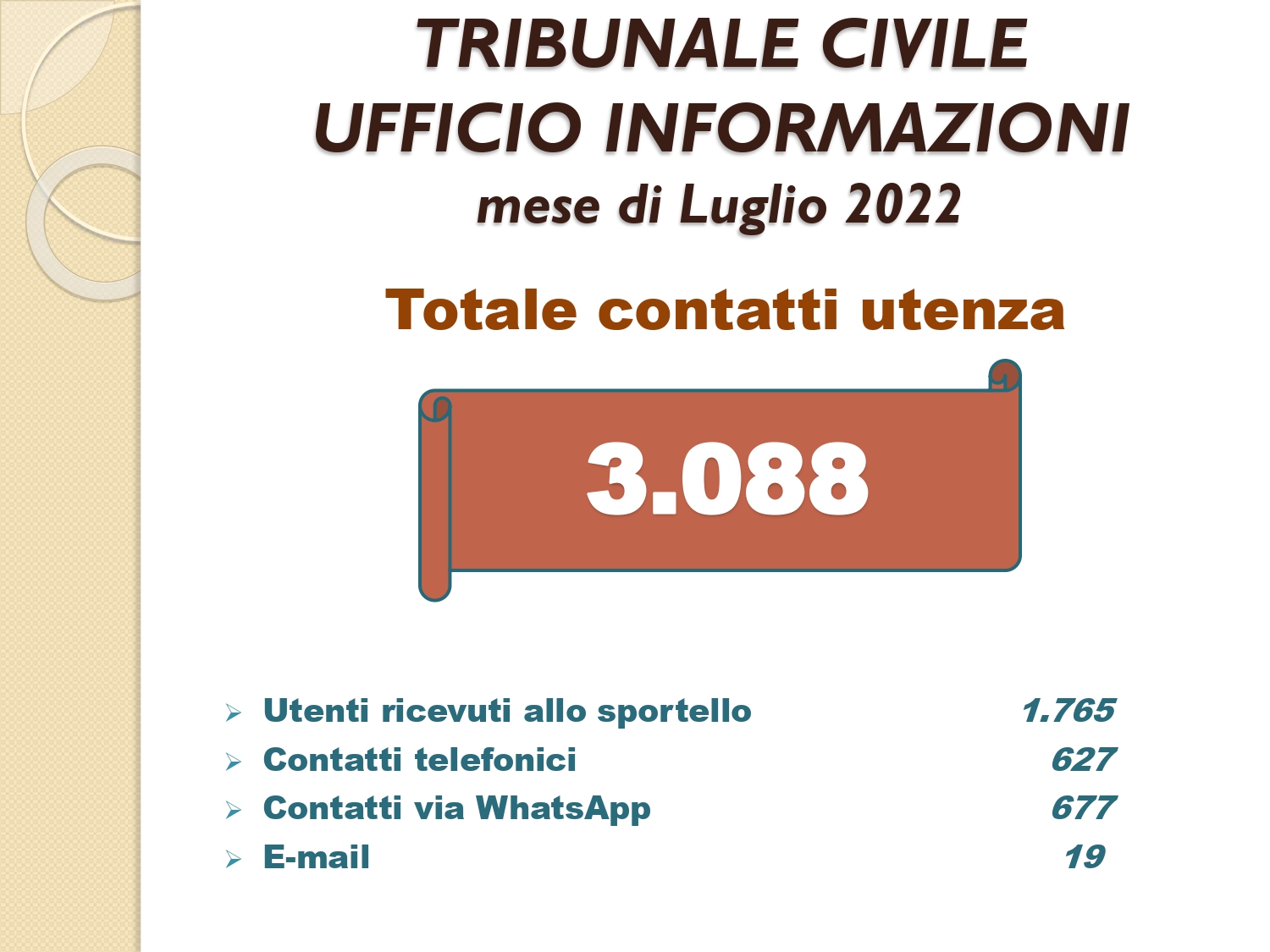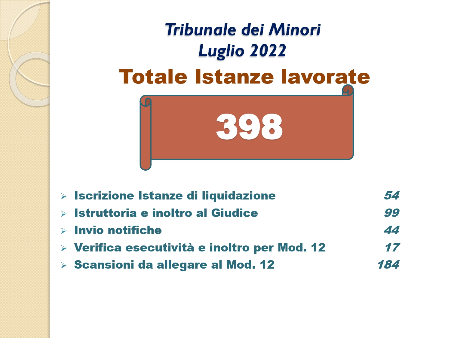 Il Consigliere Pontecorvo, nell?ambito dell?attività di monitoraggio e diffusione dei dati relativi al lavoro svolto dal personale a carico dell?Ordine e dislocato negli Uffici Giudiziari capitolini, illustra i dati aggiornati al mese di LUGLIO 2022: