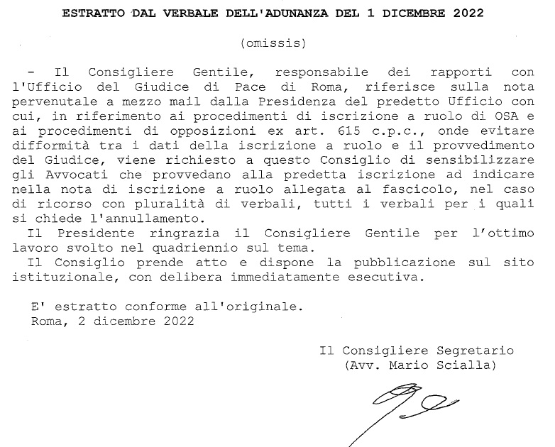 UFFICIO DEL GIUDICE DI PACE DI ROMA - nota iscrizione a ruolo procedimenti O.S.A. e art. 615 c.p.c.