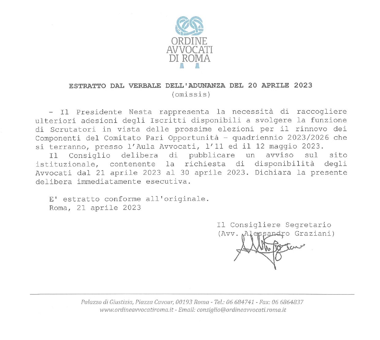La manifestazione di disponibilità, potrà essere inviata a mezzo PEC all'indirizzo: segreteria@ordineavvocatiroma.org.