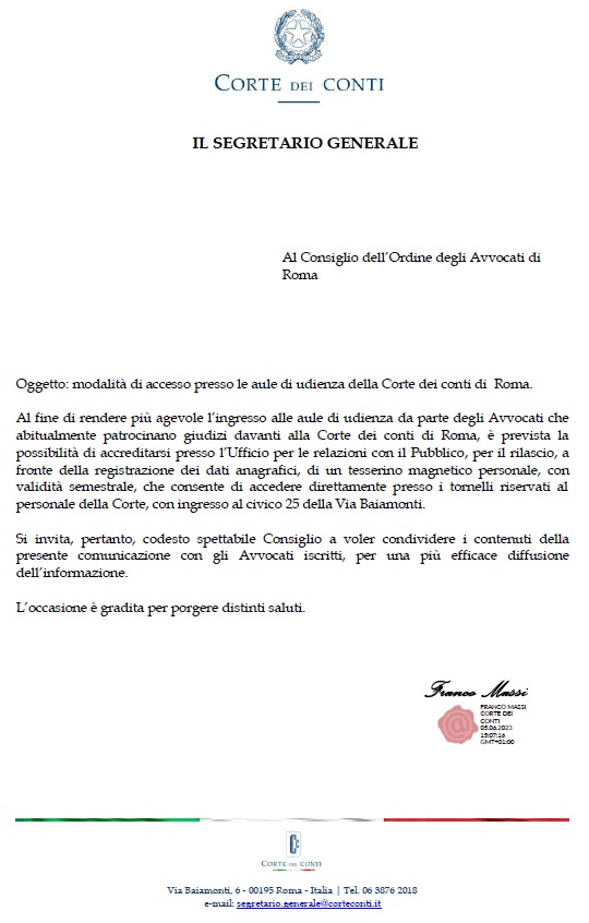 Al fine di rendere più agevole l'ingresso alle aule di udienza da parte degli Avvocati che abitualmente patrocinano giudizi davanti alla Corte dei conti di Roma, è prevista la possibilità di accreditarsi presso l'Ufficio per le relazioni con il Pubblico, per il rilascio, a fronte della registrazione dei dati anagrafici, di un tesserino magnetico personale, con validità semestrale, che consente di accedere direttamente presso i tornelli riservati al personale dell Corte, con ingresso al civico 25 della Via Baiamonti.
