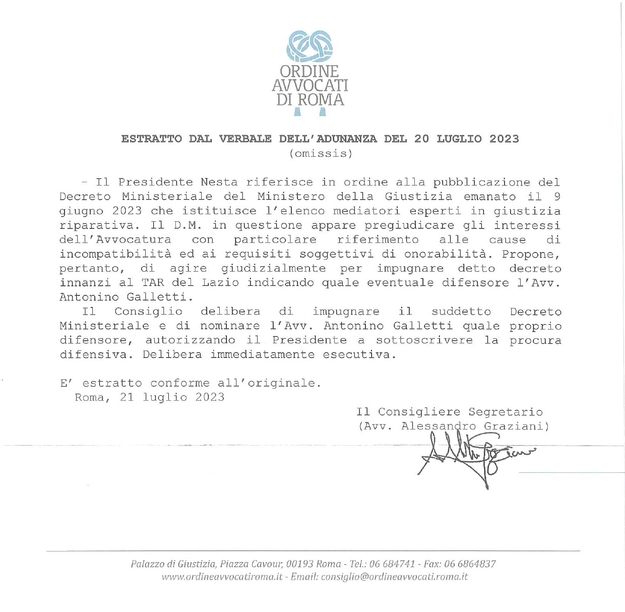 -Il Presidente Nesta riferisce in ordine alla pubblicazione del Decreto Ministeriale del Ministero della Giustizia emanato il 9 giugno 2023 che istituisce l?elenco mediatori esperti in giustizia riparativa. Il D.M. in questione appare pregiudicare gli interessi dell?Avvocatura con particolare riferimento alle cause di incompatibilità ed ai requisiti soggettivi di onorabilità. Propone, pertanto, di agire giudizialmente per impugnare detto decreto innanzi al TAR del Lazio indicando quale eventuale difensore l?Avv. Antonino Galletti.