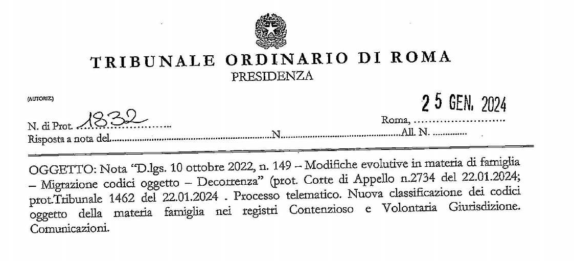 PROCESSO TELEMATICO - NUOVA CLASSIFICAZIONE DEI CODICI OGGETTO DELLA MATERIA FAMIGLIA NEI REGISTRI CONTENZIOSO E VOLONTARIA GIURISIDZIONE