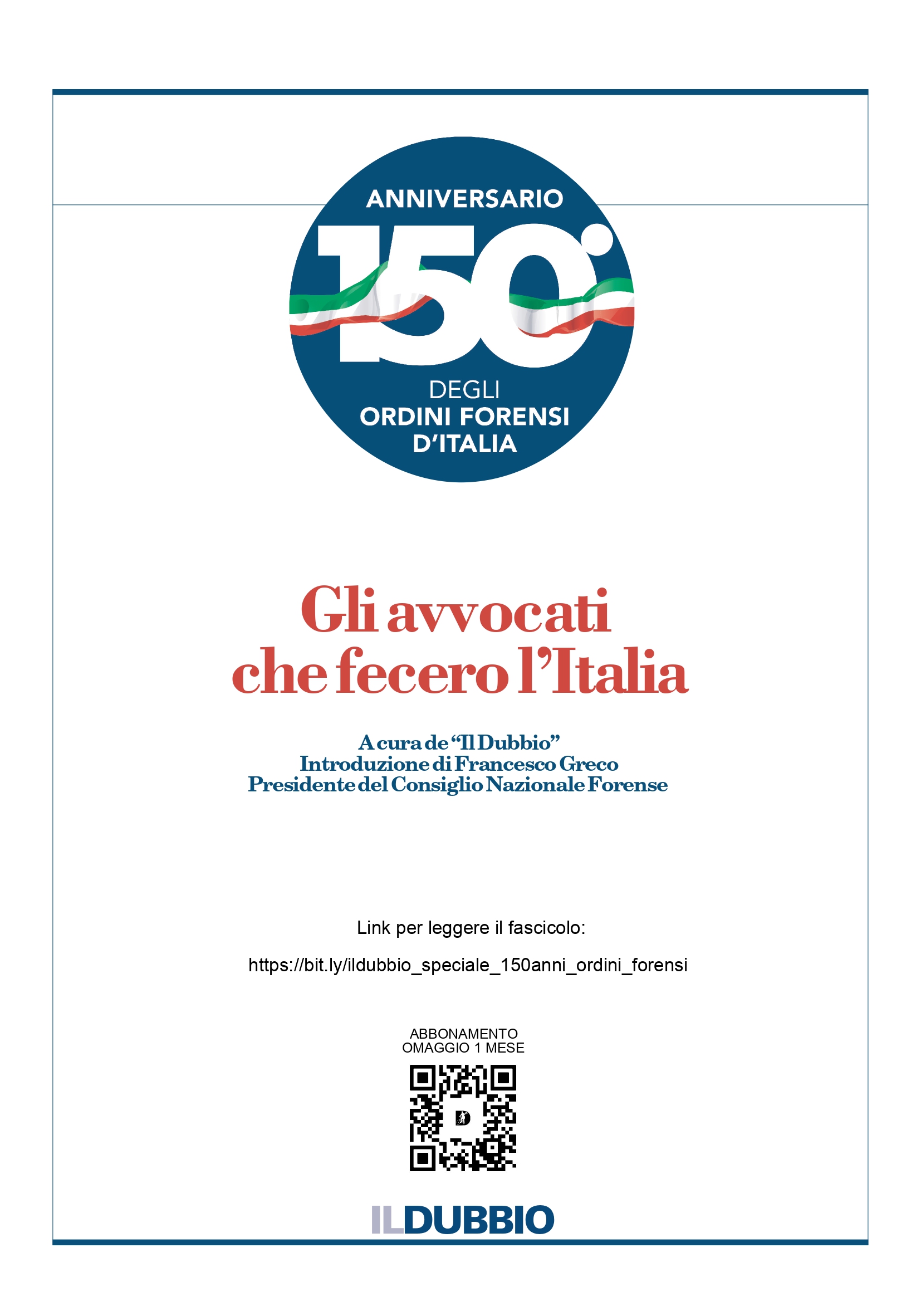 La Fondazione dell'Avvocatura Italiana (FAI) e la EDR srl editore del quotidiano IL Dubbio, in occasione della celebrazione dell'anniversario dei 150 anni degli Ordini Forensi d'Italia ha predisposto un nero speciale dal titolo "Gli Avvocati che fecero l'Italia".