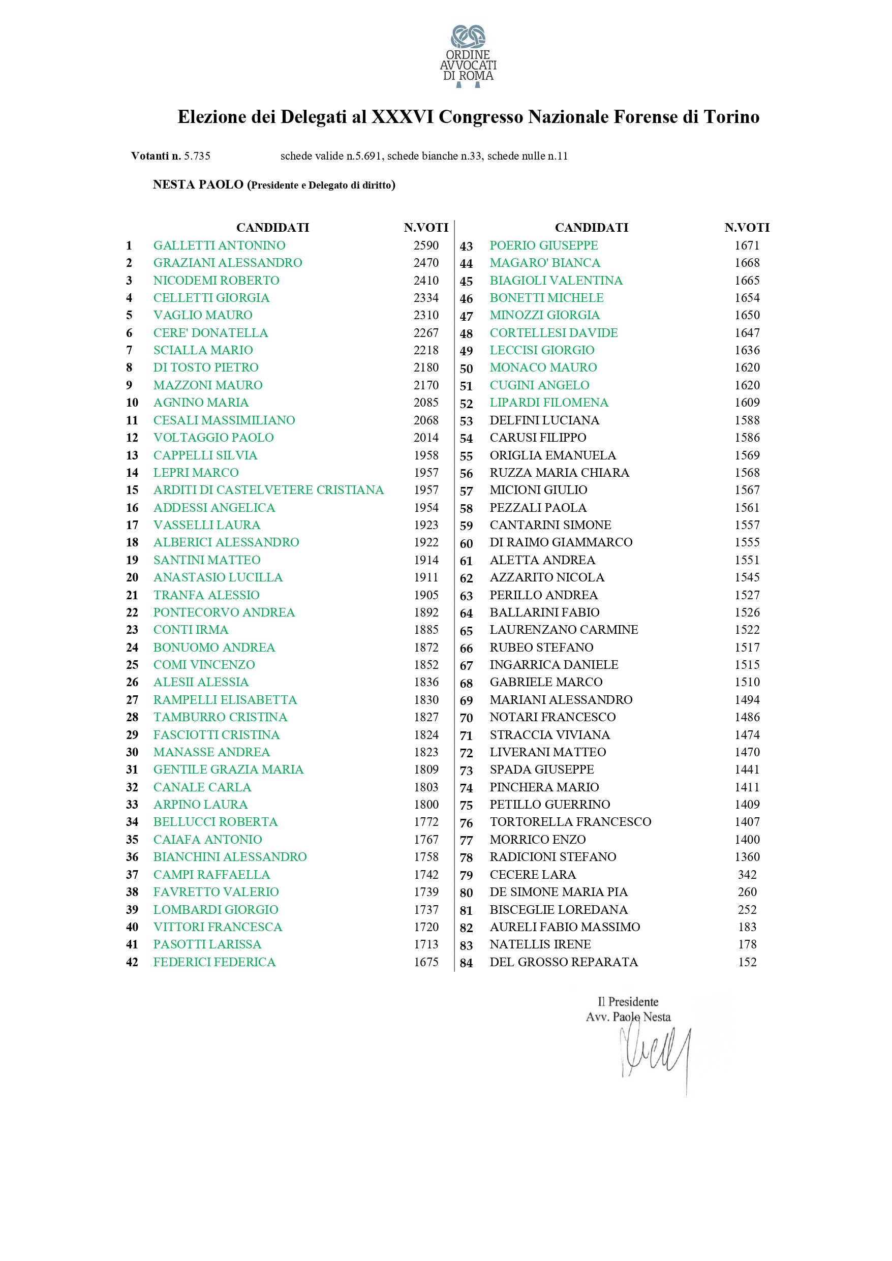 ELEZIONI DEI DELEGATI AL XXXVI CONGRESSO NAZIONALE FORENSE DI TORINO - RISULTATI ELETTORALI