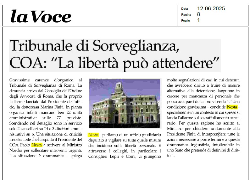 Tribunale di sorveglianza di Roma al collasso: mancano 22 unità, detenuti bloccati in carcere: l’Ordine degli Avvocati di Roma denuncia la crisi: solo 2 cancellieri su 14 in servizio. Appello al ministro Nordio per evitare il blocco delle misure alternative.