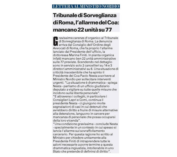 Il Presidente Paolo Nesta: "Criticità insostenibile. È una situazione è drammatica perché si tratta di un ufficio chiamato a decidere su misure che incidono direttamente sulla libertà personale. Una condizione inaccettabile soprattutto in un sistema penitenziario dove l’allarme sul sovraffollamento è costante. Per questo ho scritto al ministro Nordio, insieme alla presidente Finiti, chiedendo interventi rapidi per porre fine a quella che consideriamo una drammatica ingiustizia incompatibile con i principi di uno Stato di diritto".