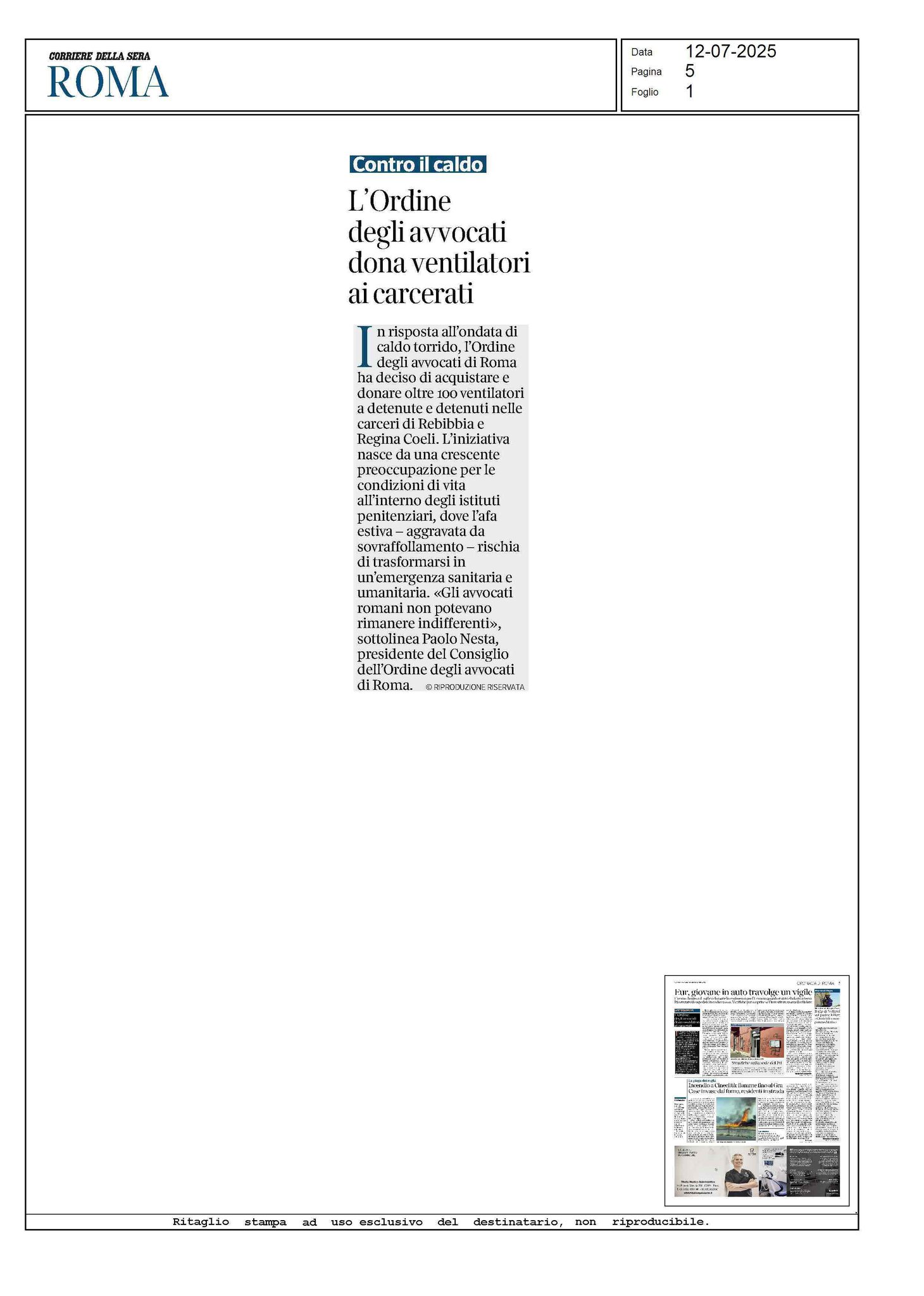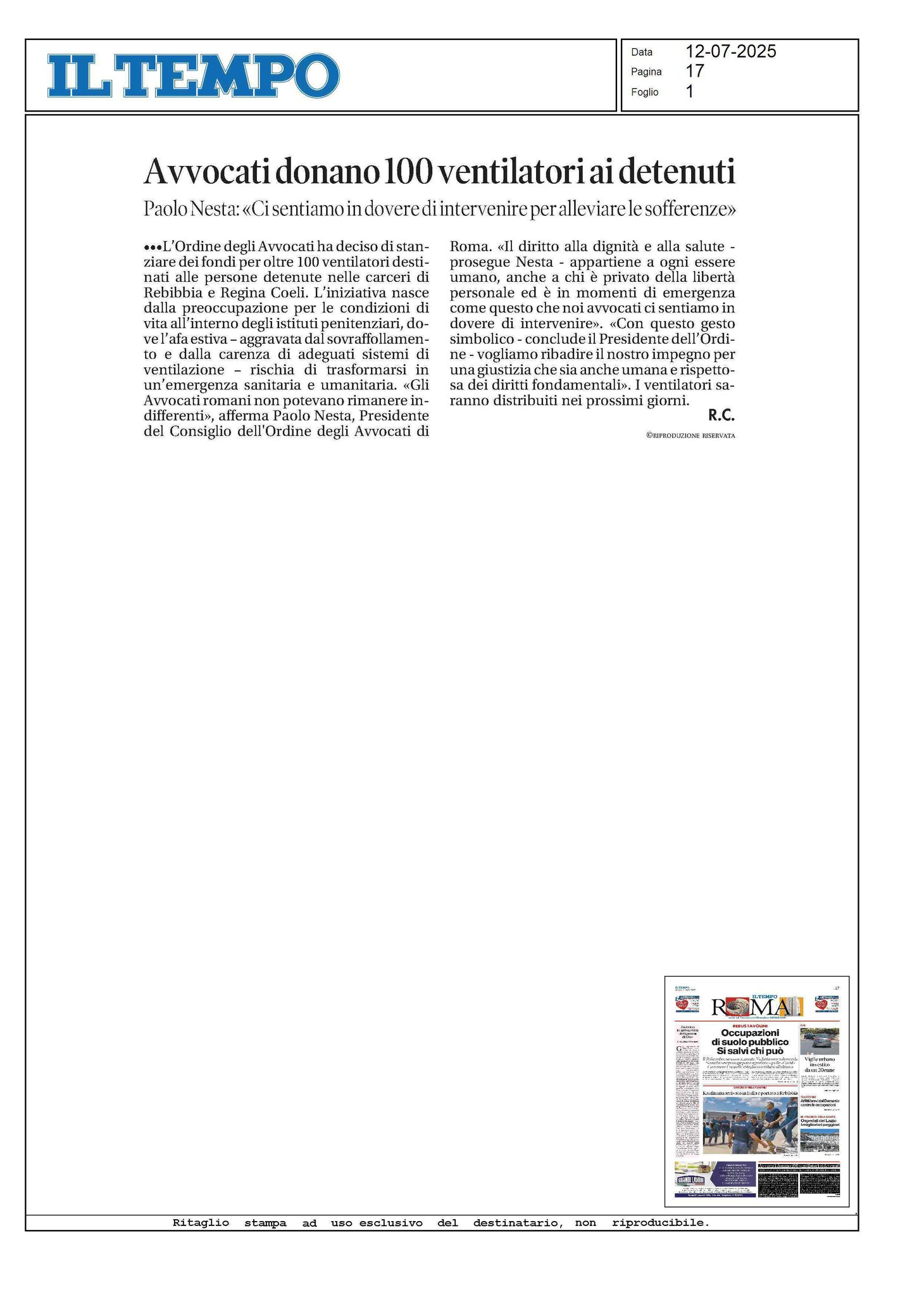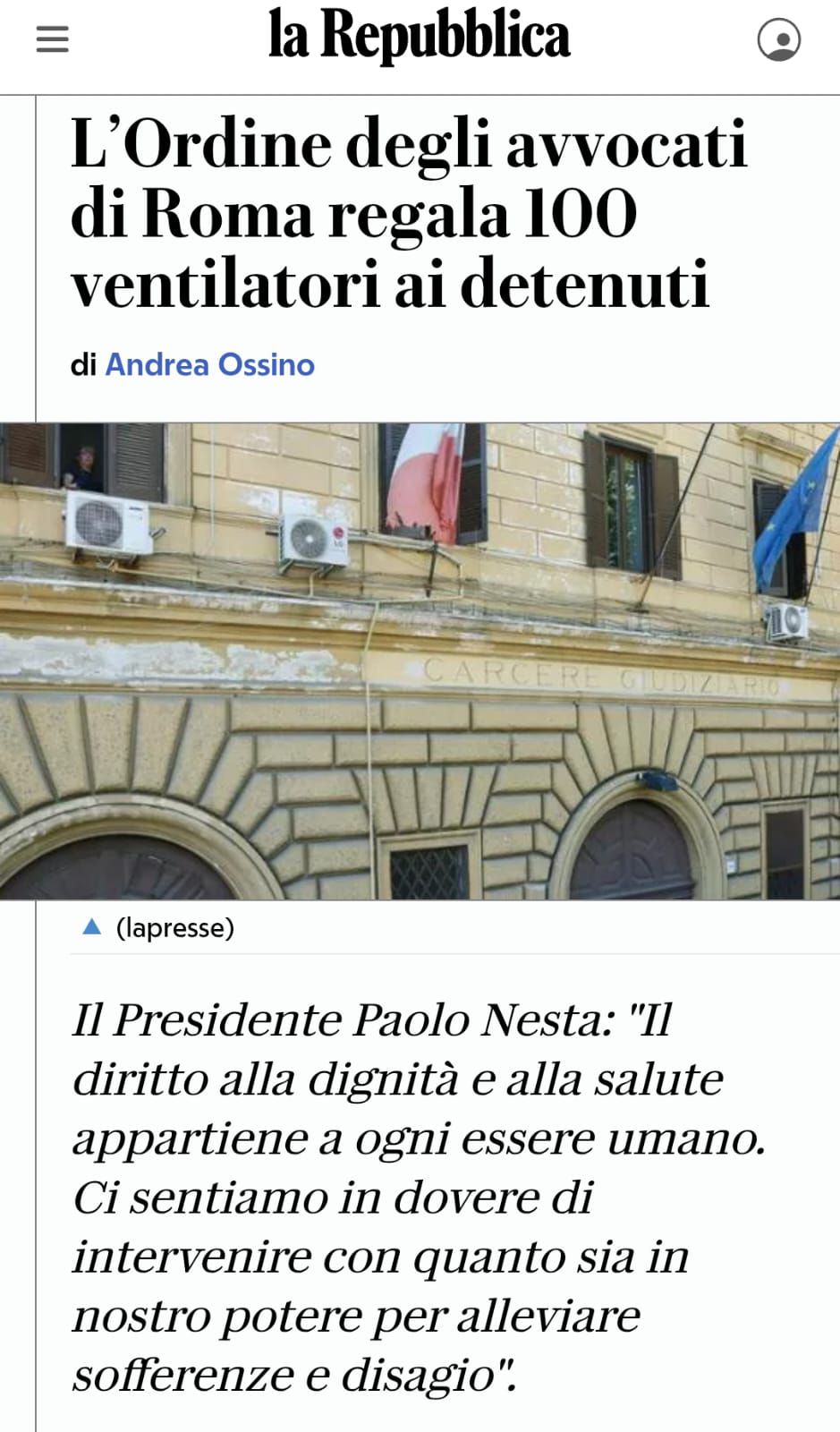 In risposta all’ondata di caldo torrido che sta investendo la città e gran parte del Paese, l’Ordine degli Avvocati di Roma ha deciso di stanziare dei fondi per oltre 100 ventilatori destinati alle persone detenute nelle carceri di Rebibbia (reparti maschile e femminile) e Regina Coeli.