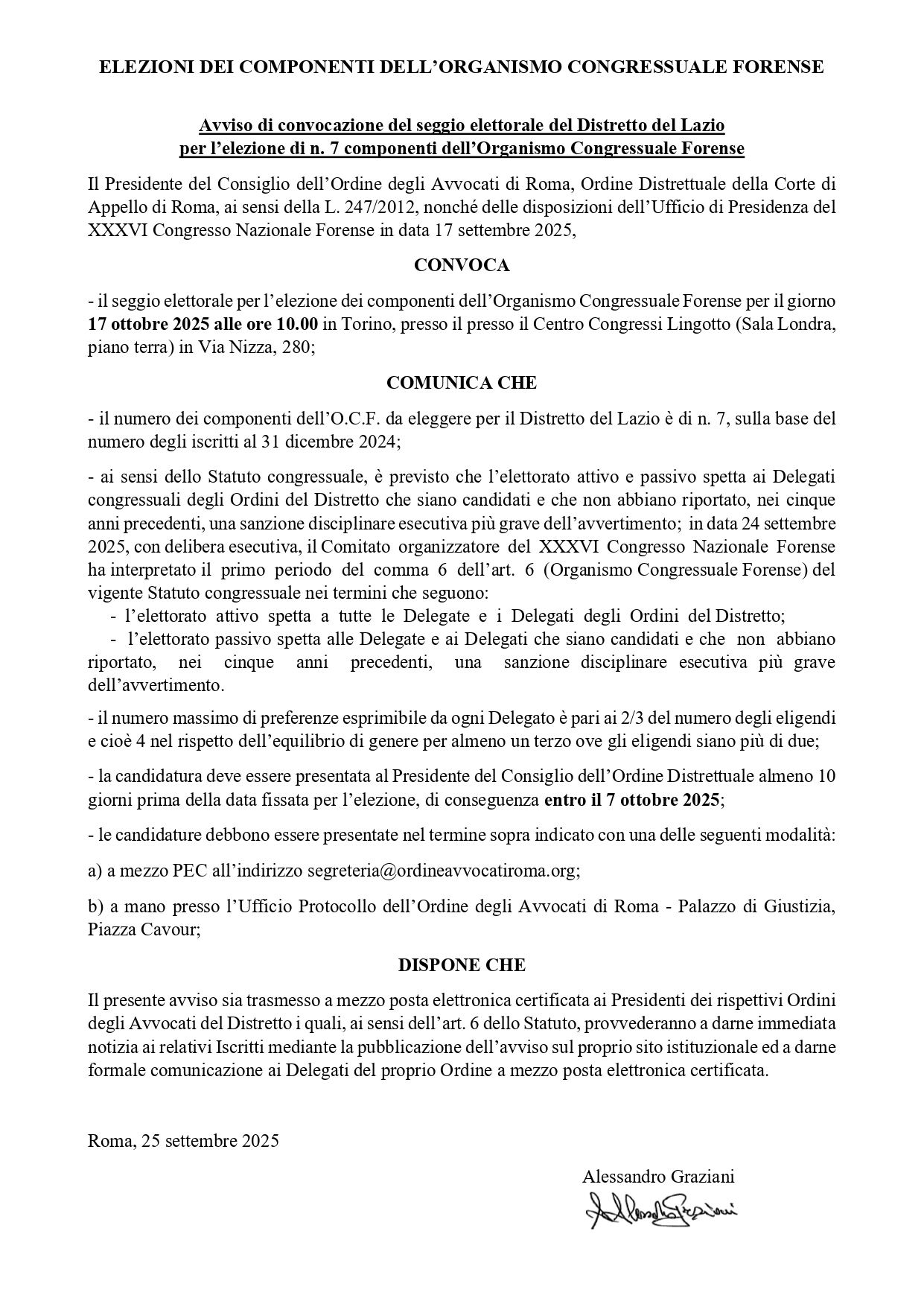 Si pubblica l'avviso di convocazione del seggio elettorale per l'elezione di n. 7 componenti dell'Organismo Congressuale Forense.