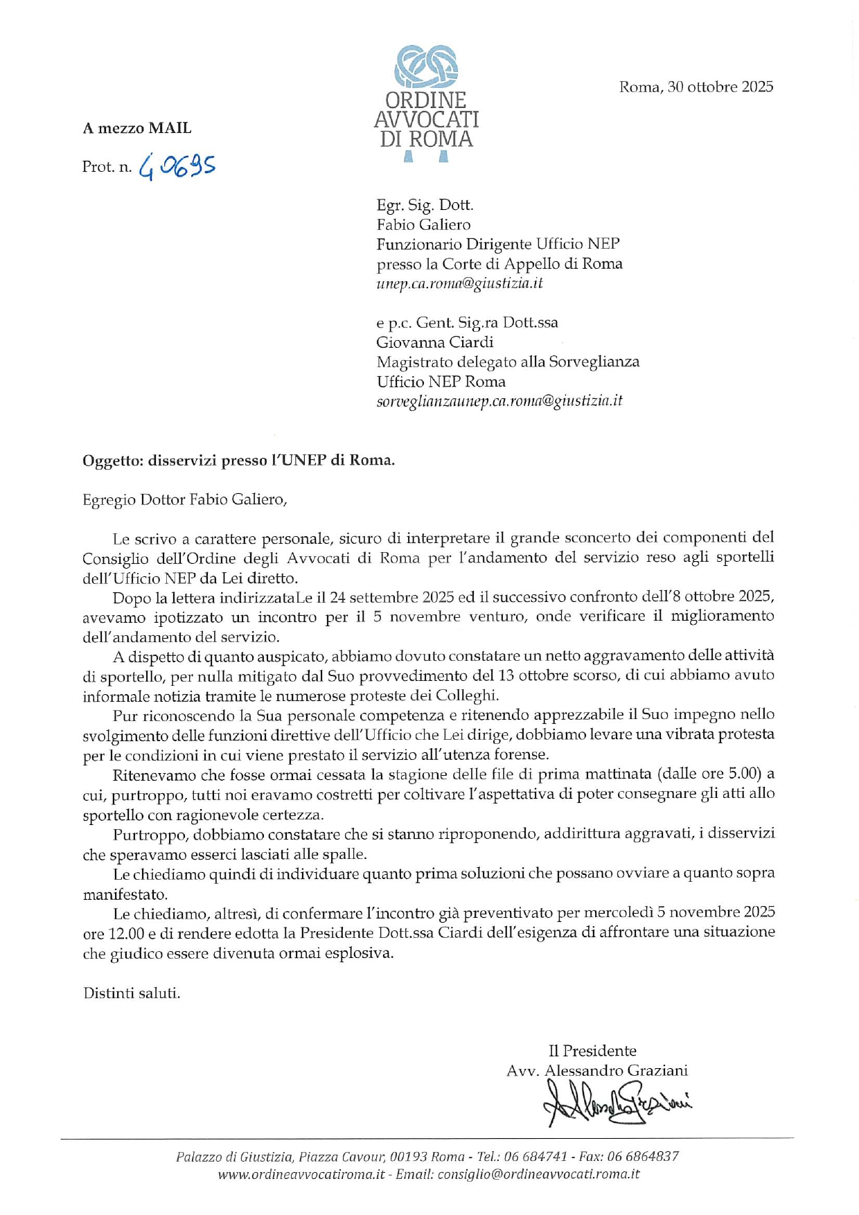 Il Presidente Graziani interviene nuovamente per denunciare i gravi disservizi dell’Ufficio Notificazioni, Esecuzioni e Protesti della Capitale, con effetti negativi sull’attività degli Avvocati e sull’intera utenza forense.