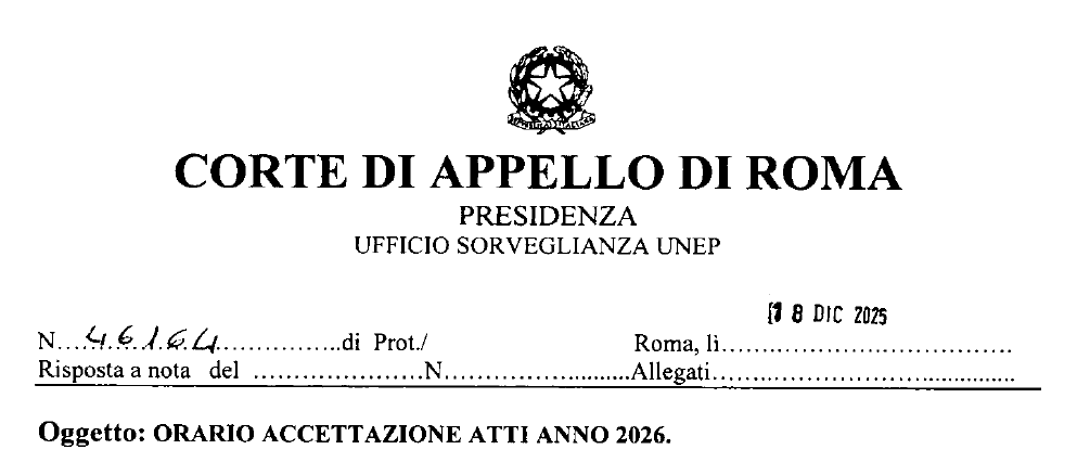 Si pubblica il decreto relativo all’orario di accettazione atti presso l’Ufficio Unico della Corte di Appello di roma e presso gli Uffici Nep dei Tribunale del Distretto per l’anno 2026.