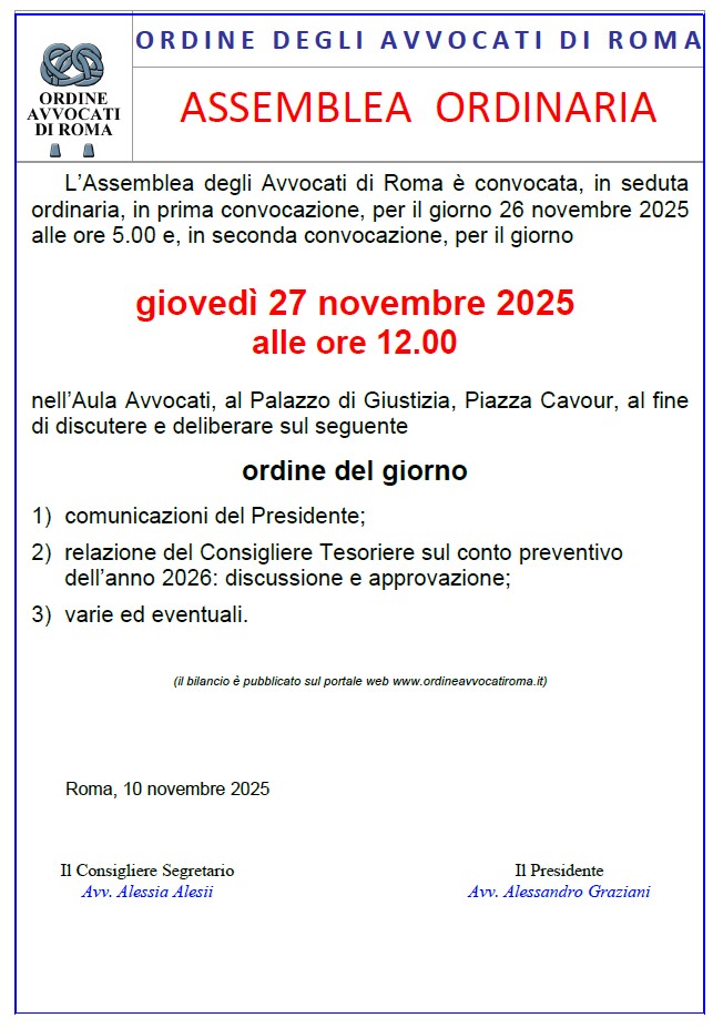 L’Assemblea degli Avvocati di Roma è convocata, in seduta ordinaria, in prima convocazione, per il giorno 26 novembre 2025 alle ore 5.00 e, in seconda convocazione, per il giorno giovedì 27 novembre 2025 alle ore 12.00.